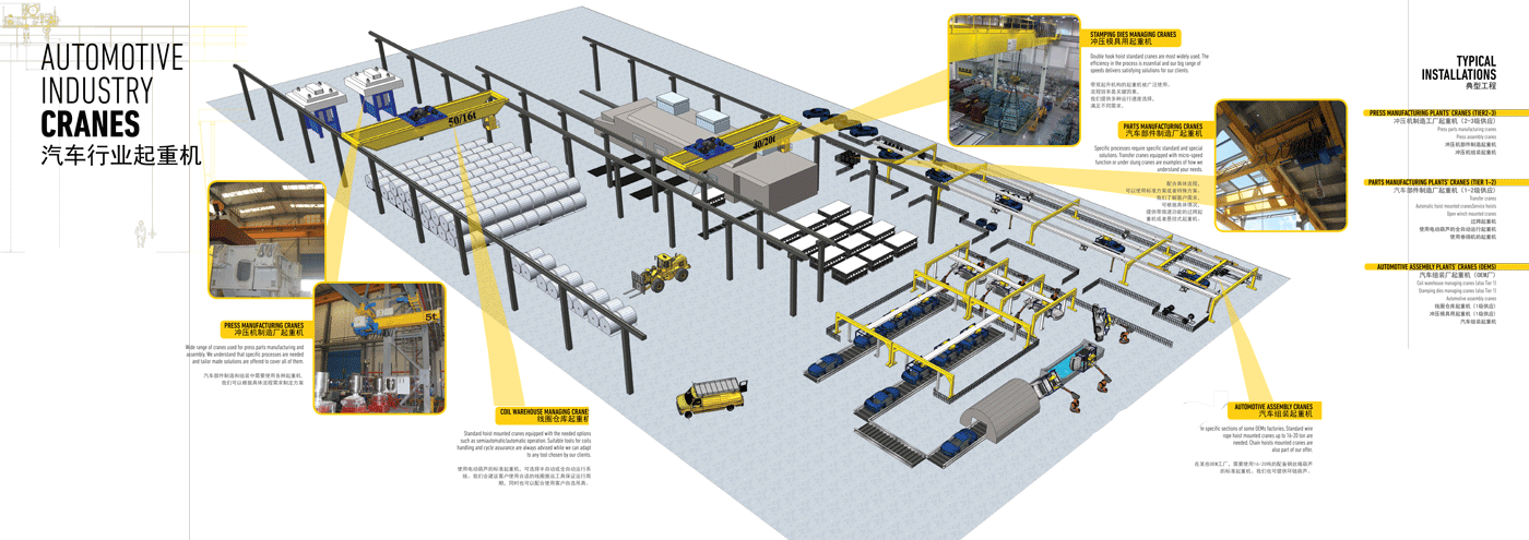 世界各地汽车行业提供吊装解决起重机方案,包括为如下各大品牌提供冲压车间用的行车。